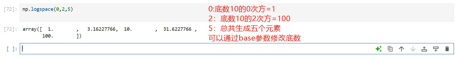 logspace(start, stop, num=50, endpoint=True, base=10.0, dtype=None, axis=0)