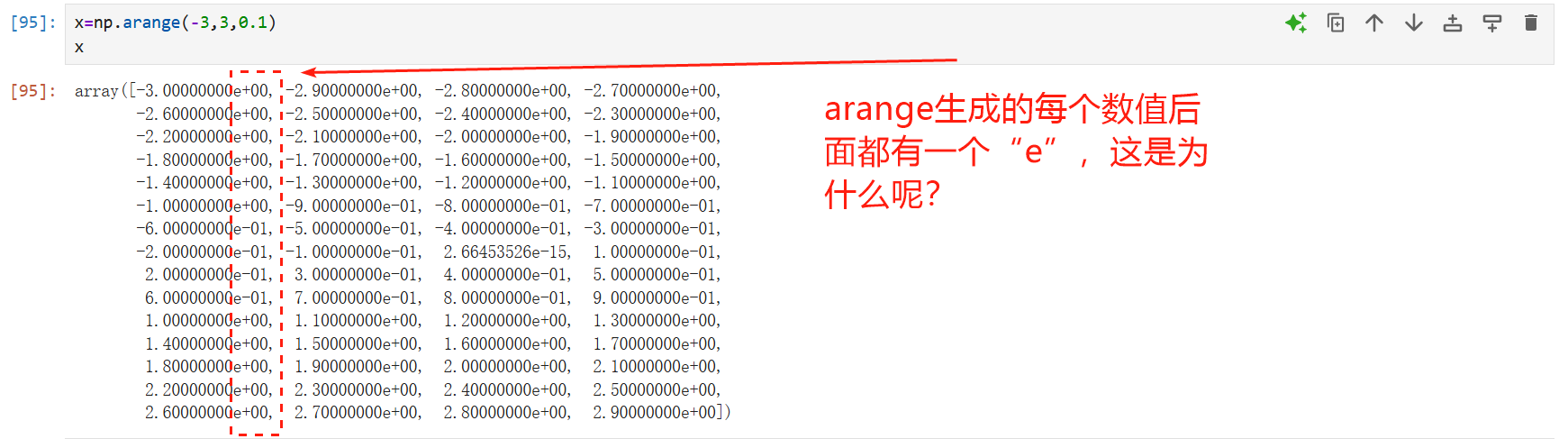 import numpy as np x = np.arange(-3, 3, 0.1) print(x[x < 1e-10]) # 输出接近 0 的极小值,如 [-1.11e-16]