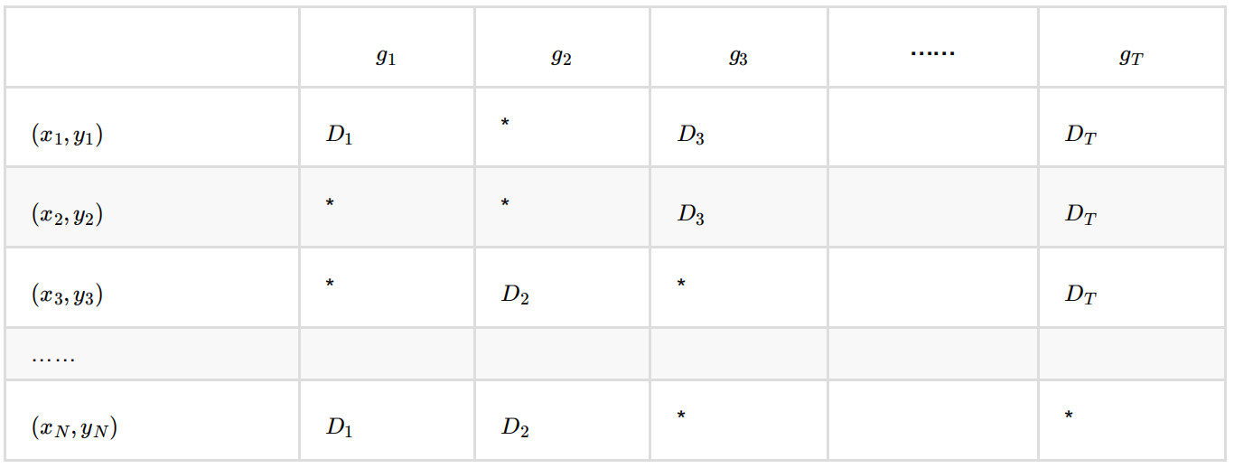 随机森林的 Bagging 过程,对于每⼀颗训练出的决策树 g t,与数据集 D 有如下关系: