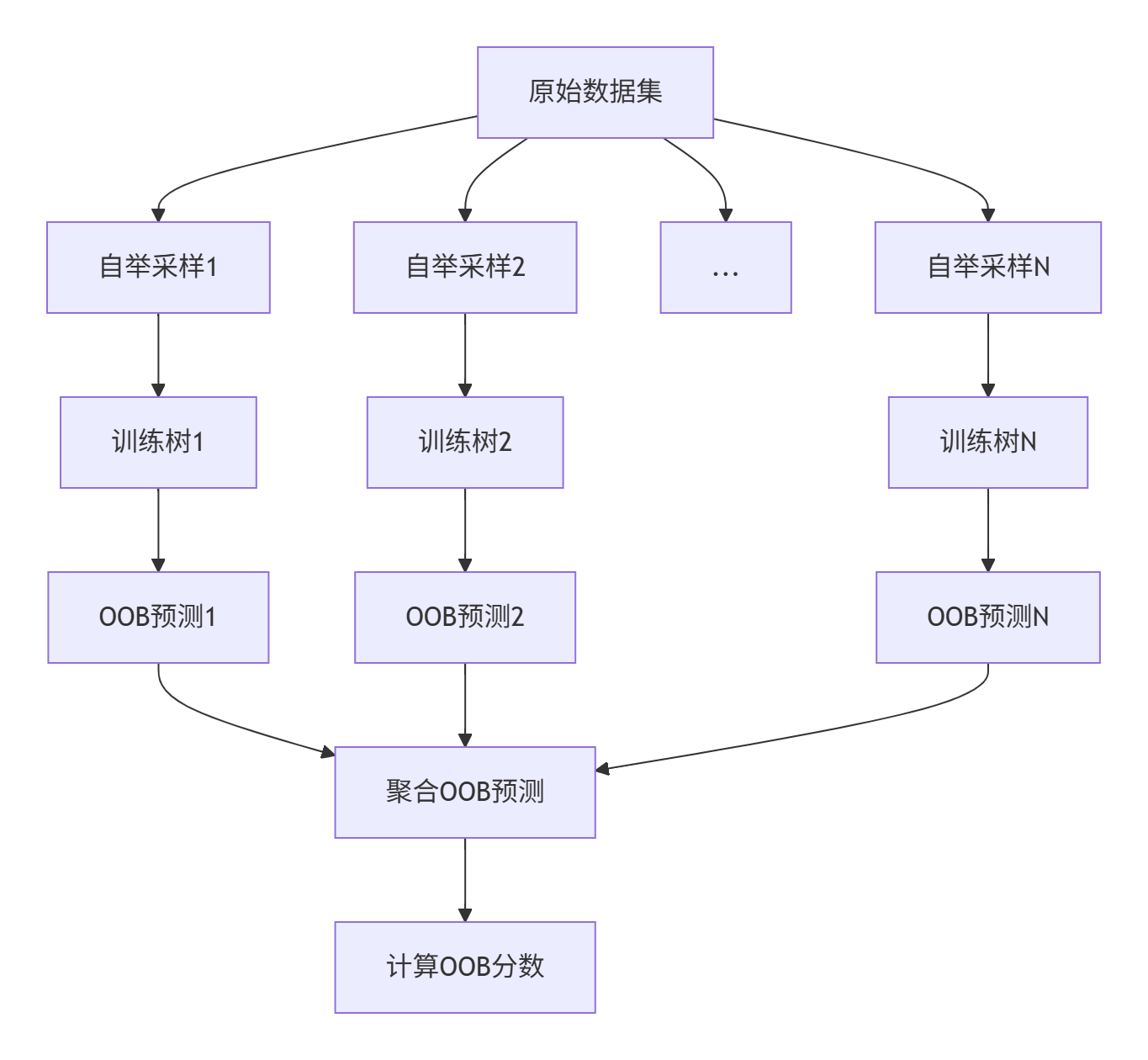 由于基分类器是构建在训练样本的⾃助抽样集上的,只有约 63.2% 原样本集出现在中,⽽剩余的 36.8% 的数据作为包外数据,可以⽤于基分类器的验证集。