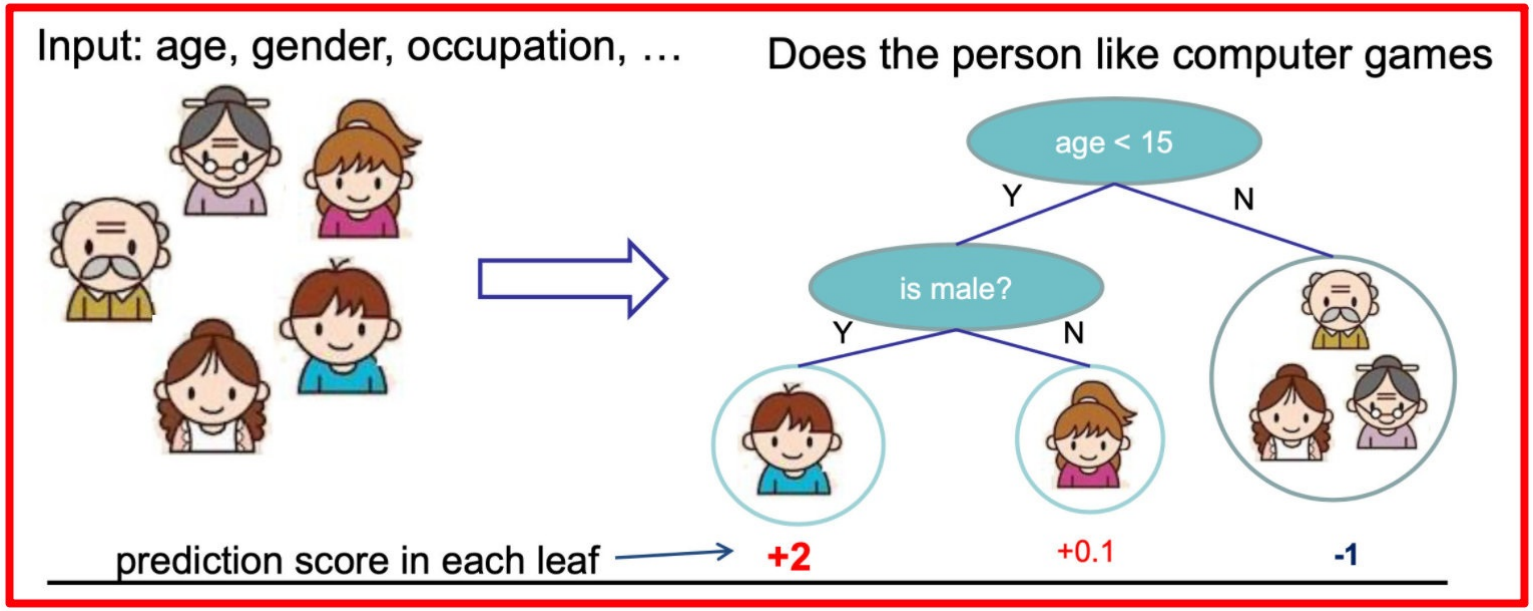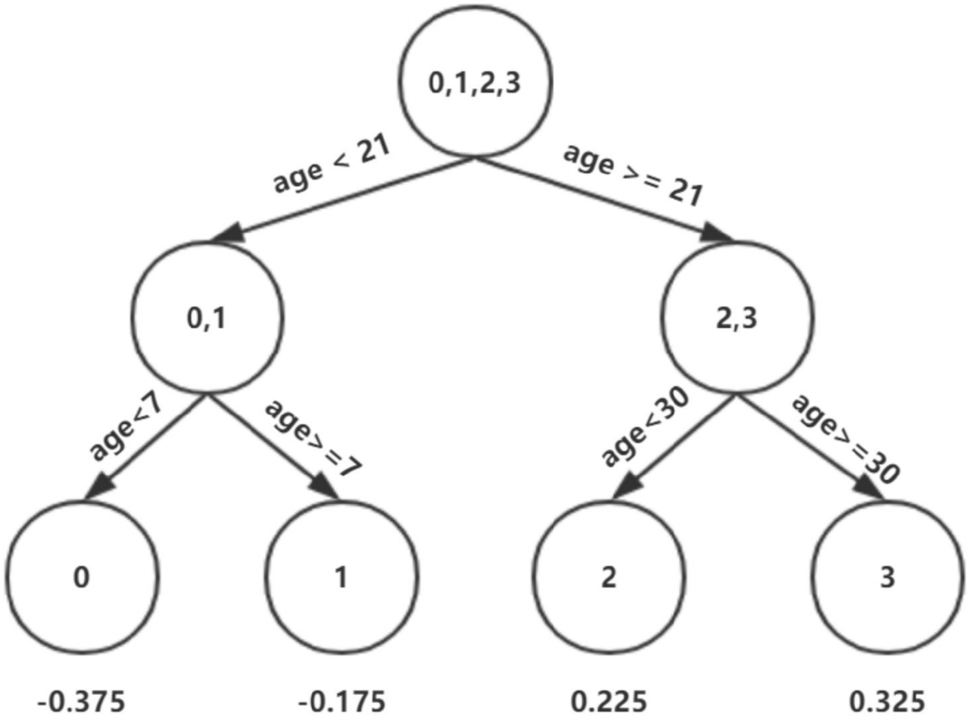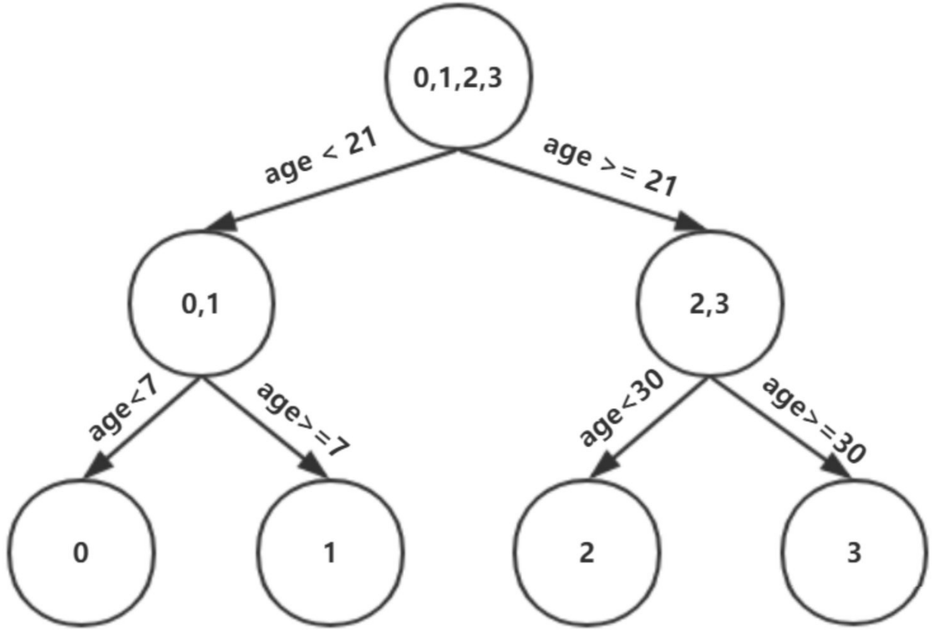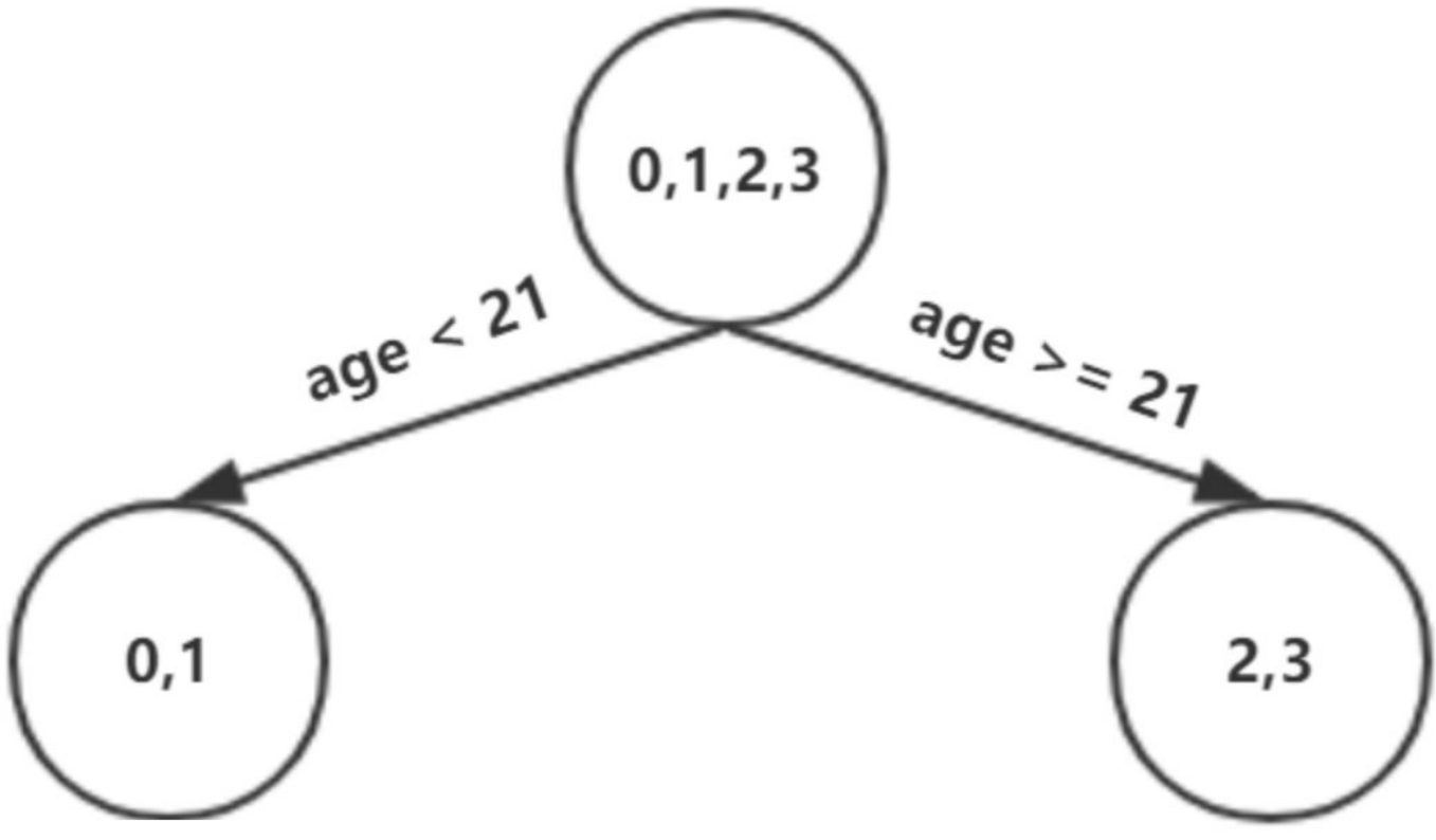 例如:以年龄21为划分节点,将⼩于21的样本划分为到左节点,⼤于等于21的样本划分为右节点。左节点包括x 0 , x 1,右节点包括样本x 2, x 3