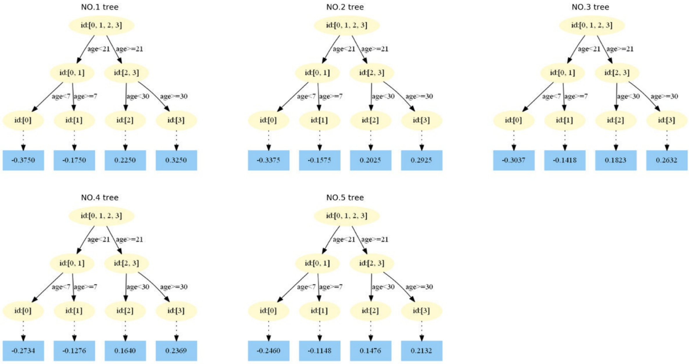 - 在f1(x)中,样本4的年龄为25,⼤于划分节点21岁,⼜⼩于30岁,所以被预测为0.2250;