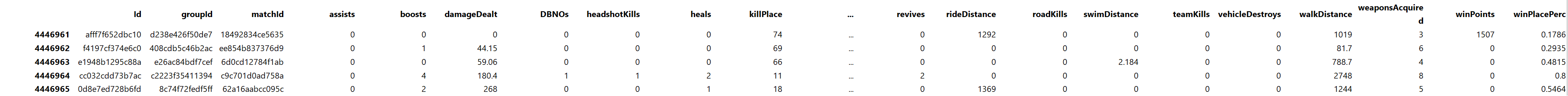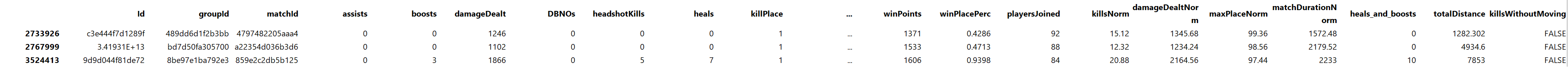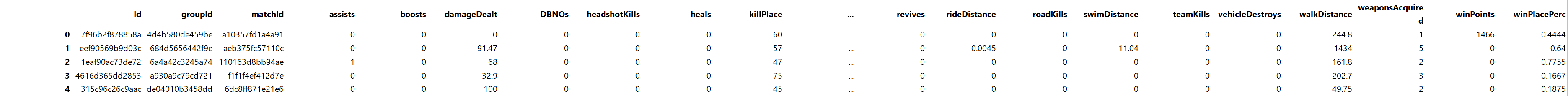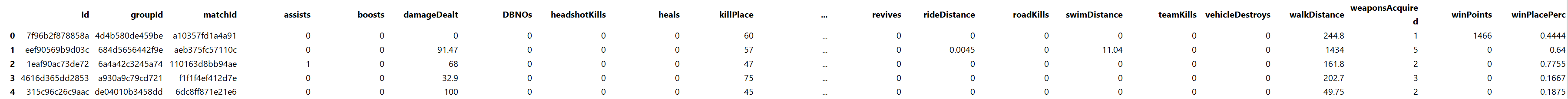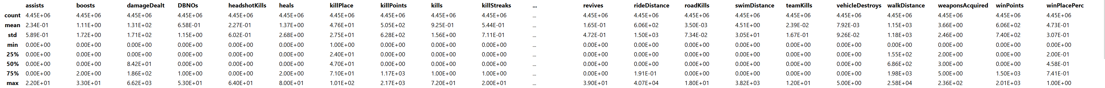 数据来⾃所有类型的⽐赛:单排,双排,四排;不保证每场⽐赛有100名⼈员,每组最多4名成员。