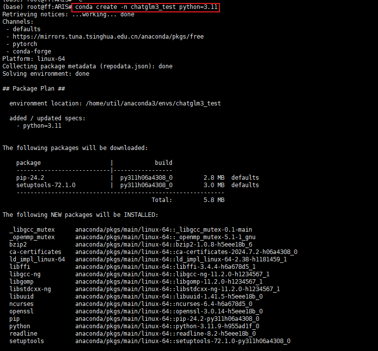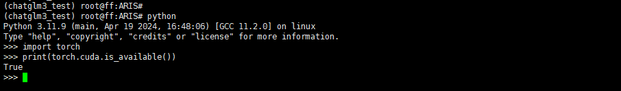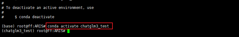 如果成功激活,可以看到在命令行的最前方的括号中,就标识了当前的虚拟环境(chatglm3_test),然后,按照官方的要求安装torch。