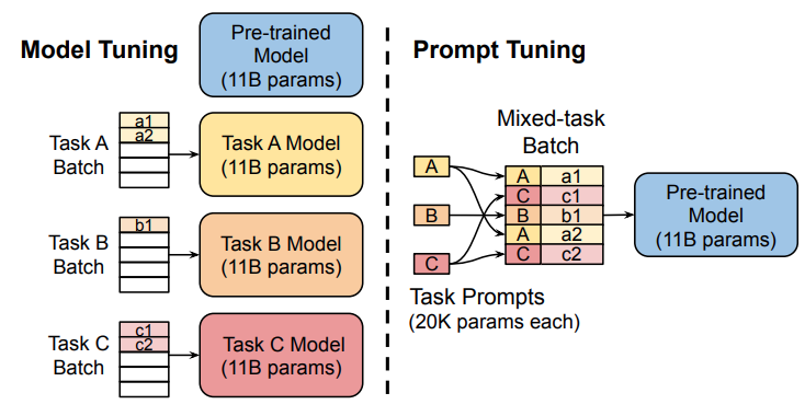 如图所示,传统的微调方法需要为每个下游任务创建整个预训练模型的任务特定副本,并且推理必须在不同的批次中进行。Prompt Tuning只需要为每个任务存储一个较小的任务特定提示,同时可以使用原始的预训练模型进行混合任务推理。Prompt Tuning可以通过反向传播更新参数来学习prompts,而不是人工设计prompts;同时冻结模型原始权重,只训练prompts参数,训练完以后,用同一个模型可以做多任务推理。