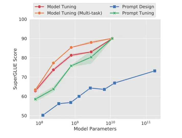 实验表明,随着大模型的参数量的增加,Prompt Tuning的方法会逼近全参数微调的结果。此外,Prompt token 的长度在20左右时的表现已经不错(超过20之后,提升Prompt token长度,对模型的性能提升不明显了),同样的,这个gap也会随着模型参数规模的提升而减小(即对于超大规模模型而言,即使 Prompt token 长度很短,对性能也不会有太大的影响)。