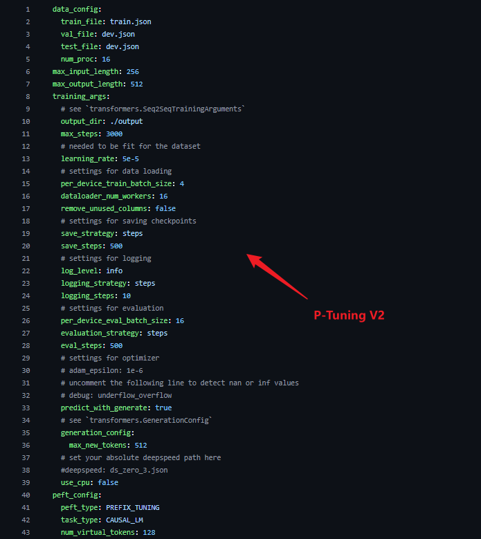 在正式微调之前可以,先通过配置文件了解以下对应的参数。P-Tuning v2的配置文件在相对路径chatglm3/finetune_demo/configs