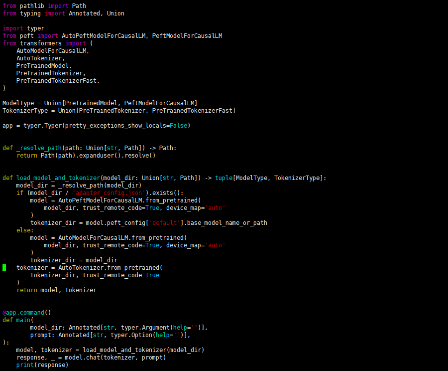 可以在 finetune_demo/inference_hf.py 中使用微调后的模型,仅需要一行代码就能进行模型的推理测试。