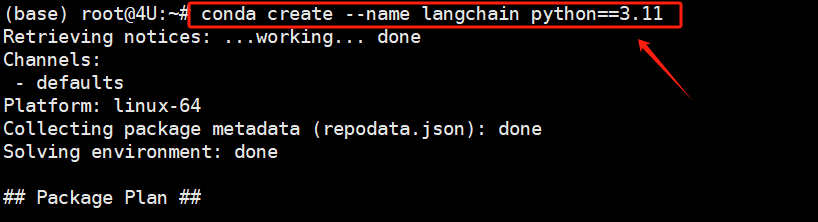 安装好Anaconda后,我们需要借助Conda包版本工具,为LangChain项目创建一个新的Python虚拟运行环境,执行代码如下: