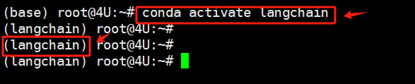 如上所示,新创建了一个名为langchain的Python虚拟环境,其Python版本为3.11。创建完成后,通过如下命令进入该虚拟环境,执行后续的操作: