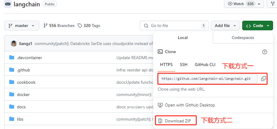 进入LangChain的官方Github,地址:https://github.com/langchain-ai/langchain , 在 GitHub 上将项目文件下载到有两种方式:克隆 (Clone) 和 下载 ZIP 压缩包。推荐使用克隆 (Clone)的方式。我们首先在GitHub上找到其仓库的URL。