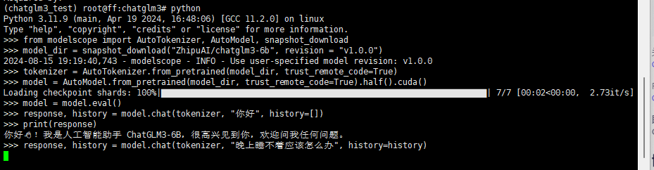 在python环境中继续输入以下代码调用 ChatGLM3-6B 模型来生成对话:
