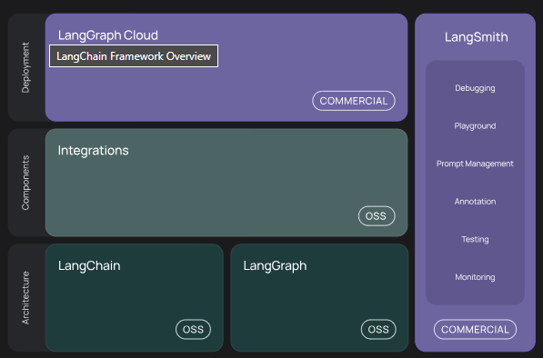 如今Lanchain已经形成了一套丰富的框架体系,包括LangChain、LangGraph、LangGraph Cloud 和 LangSmith ,它们都是与语言模型(LLM)及其工具生态相关的框架或服务,下面是它们的关系和主要功能区别: