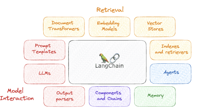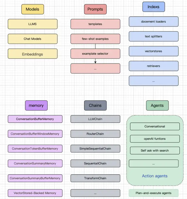 从本质上分析,LangChain还是依然采用从大模型自身出发的策略,通过开发人员在实践过程中对大模型能力的深入理解及其在不同场景下的涌现潜力,使用模块化的方式进行高级抽象,设计出统一接口以适配各种大模型。到目前为止,LangChain抽象出最重要的核心模块如下: