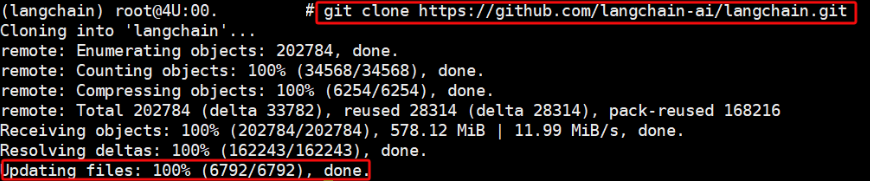 执行克隆命令,将LangChain Github上的项目文件下载至本地的当前路径下,如下: