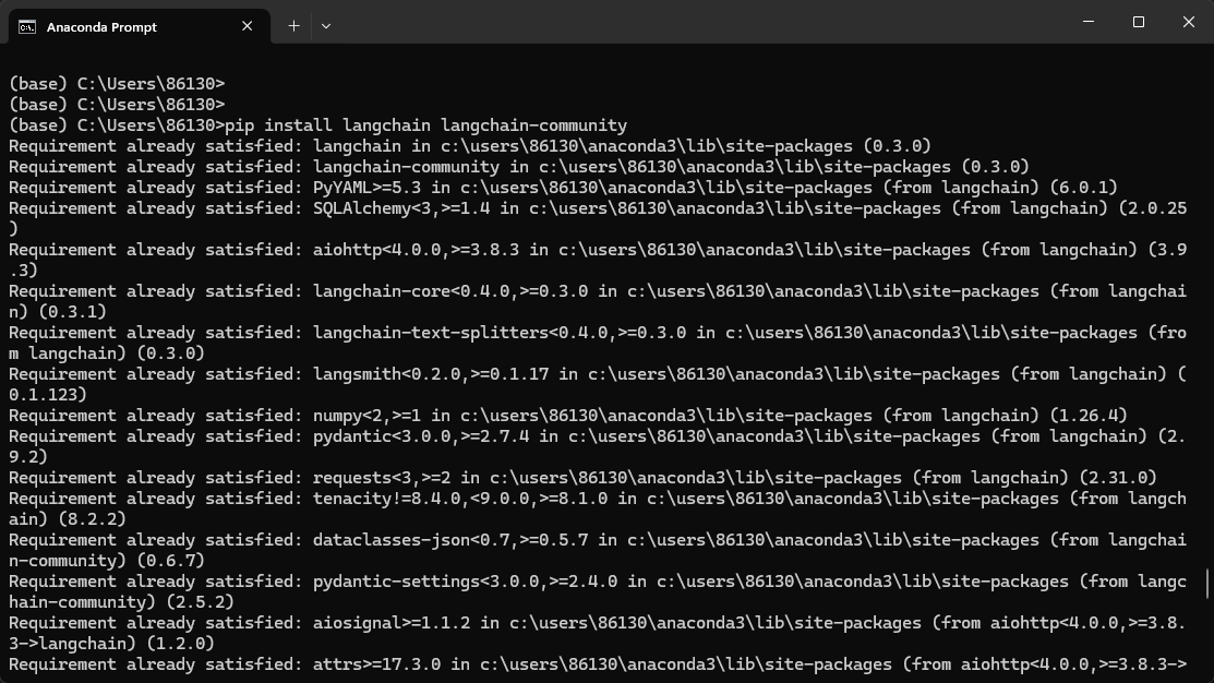 Requirement already satisfied: langchain in d:\software\anaconda3\lib\site-packages (0.1.10)Requirement already satisfied: PyYAML>=5.3 in d:\software\anaconda3\lib\site-packages (from langchain) (6.0)Requirement already satisfied: SQLAlchemy<3,>=1.4 in d:\software\anaconda3\lib\site-packages (from langchain) (1.4.39)Requirement already satisfied: aiohttp<4.0.0,>=3.8.3 in d:\software\anaconda3\lib\site-packages (from langchain) (3.8.5)Requirement already satisfied: dataclasses-json<0.7,>=0.5.7 in d:\software\anaconda3\lib\site-packages (from langchain) (0.6.4)Requirement already satisfied: jsonpatch<2.0,>=1.33 in d:\software\anaconda3\lib\site-packages (from langchain) (1.33)Requirement already satisfied: langchain-community<0.1,>=0.0.25 in d:\software\anaconda3\lib\site-packages (from langchain) (0.0.25)Requirement already satisfied: langchain-core<0.2,>=0.1.28 in d:\software\anaconda3\lib\site-packages (from langchain) (0.1.28)Requirement already satisfied: langchain-text-splitters<0.1,>=0.0.1 in d:\software\anaconda3\lib\site-packages (from langchain) (0.0.1)Requirement already satisfied: langsmith<0.2.0,>=0.1.0 in d:\software\anaconda3\lib\site-packages (from langchain) (0.1.14)Requirement already satisfied: numpy<2,>=1 in d:\software\anaconda3\lib\site-packages (from langchain) (1.24.3)Requirement already satisfied: pydantic<3,>=1 in d:\software\anaconda3\lib\site-packages (from langchain) (2.6.0)Requirement already satisfied: requests<3,>=2 in d:\software\anaconda3\lib\site-packages (from langchain) (2.31.0)Requirement already satisfied: tenacity<9.0.0,>=8.1.0 in d:\software\anaconda3\lib\site-packages (from langchain) (8.2.2)Requirement already satisfied: attrs>=17.3.0 in d:\software\anaconda3\lib\site-packages (from aiohttp<4.0.0,>=3.8.3->langchain) (22.1.0)Requirement already satisfied: charset-normalizer<4.0,>=2.0 in d:\software\anaconda3\lib\site-packages (from aiohttp<4.0.0,>=3.8.3->langchain) (2.0.4)Requirement already satisfied: multidict<7.0,>=4.5 in d:\software\anaconda3\lib\site-packages (from aiohttp<4.0.0,>=3.8.3->langchain) (6.0.2)Requirement already satisfied: async-timeout<5.0,>=4.0.0a3 in d:\software\anaconda3\lib\site-packages (from aiohttp<4.0.0,>=3.8.3->langchain) (4.0.2)Requirement already satisfied: yarl<2.0,>=1.0 in d:\software\anaconda3\lib\site-packages (from aiohttp<4.0.0,>=3.8.3->langchain) (1.8.1)Requirement already satisfied: frozenlist>=1.1.1 in d:\software\anaconda3\lib\site-packages (from aiohttp<4.0.0,>=3.8.3->langchain) (1.3.3)Requirement already satisfied: aiosignal>=1.1.2 in d:\software\anaconda3\lib\site-packages (from aiohttp<4.0.0,>=3.8.3->langchain) (1.2.0)Requirement already satisfied: marshmallow<4.0.0,>=3.18.0 in d:\software\anaconda3\lib\site-packages (from dataclasses-json<0.7,>=0.5.7->langchain) (3.21.0)Requirement already satisfied: typing-inspect<1,>=0.4.0 in d:\software\anaconda3\lib\site-packages (from dataclasses-json<0.7,>=0.5.7->langchain) (0.9.0)Requirement already satisfied: jsonpointer>=1.9 in d:\software\anaconda3\lib\site-packages (from jsonpatch<2.0,>=1.33->langchain) (2.1)Requirement already satisfied: anyio<5,>=3 in d:\software\anaconda3\lib\site-packages (from langchain-core<0.2,>=0.1.28->langchain) (3.5.0)Requirement already satisfied: packaging<24.0,>=23.2 in d:\software\anaconda3\lib\site-packages (from langchain-core<0.2,>=0.1.28->langchain) (23.2)Requirement already satisfied: orjson<4.0.0,>=3.9.14 in d:\software\anaconda3\lib\site-packages (from langsmith<0.2.0,>=0.1.0->langchain) (3.9.15)Requirement already satisfied: annotated-types>=0.4.0 in d:\software\anaconda3\lib\site-packages (from pydantic<3,>=1->langchain) (0.6.0)Requirement already satisfied: pydantic-core==2.16.1 in d:\software\anaconda3\lib\site-packages (from pydantic<3,>=1->langchain) (2.16.1)Requirement already satisfied: typing-extensions>=4.6.1 in d:\software\anaconda3\lib\site-packages (from pydantic<3,>=1->langchain) (4.7.1)Requirement already satisfied: idna<4,>=2.5 in d:\software\anaconda3\lib\site-packages (from requests<3,>=2->langchain) (3.4)Requirement already satisfied: urllib3<3,>=1.21.1 in d:\software\anaconda3\lib\site-packages (from requests<3,>=2->langchain) (1.26.16)Requirement already satisfied: certifi>=2017.4.17 in d:\software\anaconda3\lib\site-packages (from requests<3,>=2->langchain) (2023.11.17)Requirement already satisfied: greenlet!=0.4.17 in d:\software\anaconda3\lib\site-packages (from SQLAlchemy<3,>=1.4->langchain) (2.0.1)Requirement already satisfied: sniffio>=1.1 in d:\software\anaconda3\lib\site-packages (from anyio<5,>=3->langchain-core<0.2,>=0.1.28->langchain) (1.2.0)Requirement already satisfied: mypy-extensions>=0.3.0 in d:\software\anaconda3\lib\site-packages (from typing-inspect<1,>=0.4.0->dataclasses-json<0.7,>=0.5.7->langchain) (1.0.0)