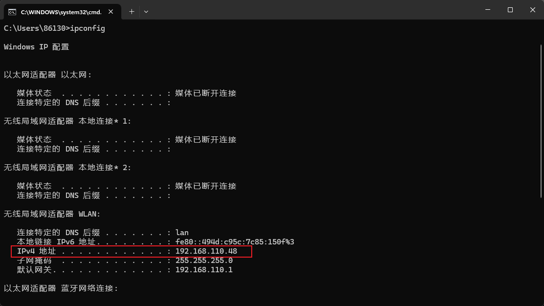 通过在命令行输入ipconfig可以看到对应机器的网络适配器,其中IPv4地址是局域网中唯一标识。