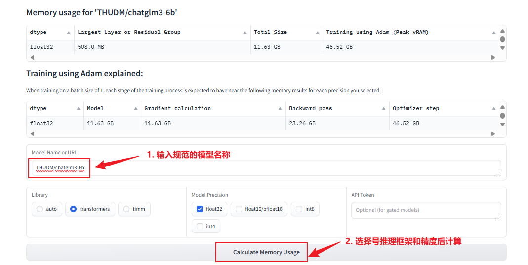 在进行大模型、微调、训练的时候,相信大家尝尝会遇到这样的苦恼,即:不知道自己的机器是否可以胜任对应的大模型推理/训练任务,或者不知道想要训练对应目标的大模型需要多大的显卡配置等,今天为大家推荐的是一款用来解决这一问题的实用小程序,这个工具将帮助您计算在 Hugging Face Hub上托管的模型进行训练和大型模型推理所需的vRAM(虚拟随机存取存储器)数量。模型所需的最小推荐vRAM以“最大层”的大小表示,而模型训练大致需要其大小的4倍(对于Adam优化器)。这些计算的准确性最多在几个百分点以内,例如bert-base-cased模型为413.68 MB,而计算器估计为413.18 MB。在执行推理时,预计需要额外增加高达20%,这是由EleutherAI发现的。将来会进行更多测试,以获得每个模型更准确的基准。目前,这个工具支持所有使用transformers和timm的托管模型。要使用这个工具,请输入您想要计算内存使用量的模型的URL或模型名称,选择它源自哪个框架(“auto”将尝试从模型元数据中检测),以及您想要使用的精度。