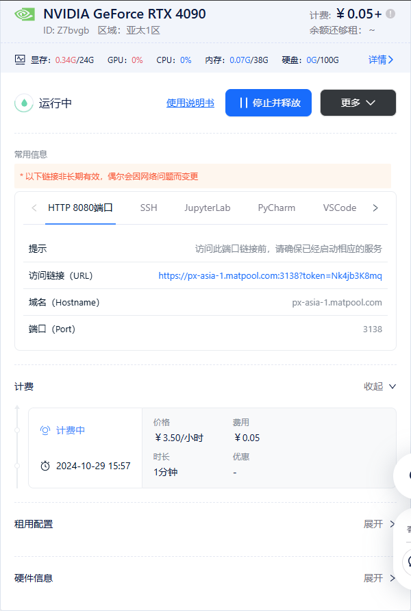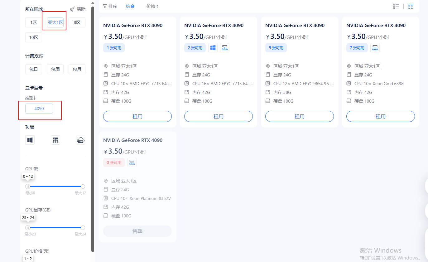 确认⽤⼾余额充裕后点击左上⻆的算⼒市场,租赁合适的主机,推荐的配置为:计费⽅式选择按量计 费、地区任选、GPU型号选择RTX3090/24GB、GPU数量选择为1。
