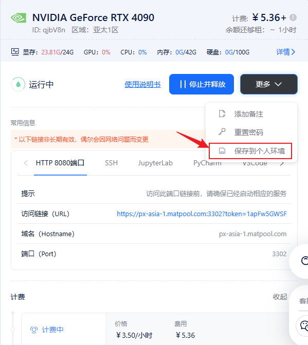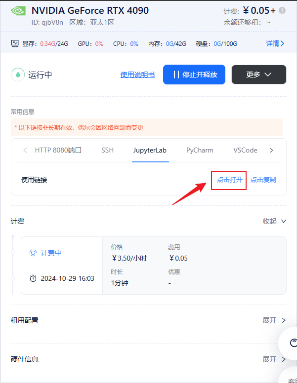 创建完成后,点击左边栏的容器实例便可随时找到配置好的实例,在快捷⼯具栏中点击Jupyter lab开始模型的安装部署。