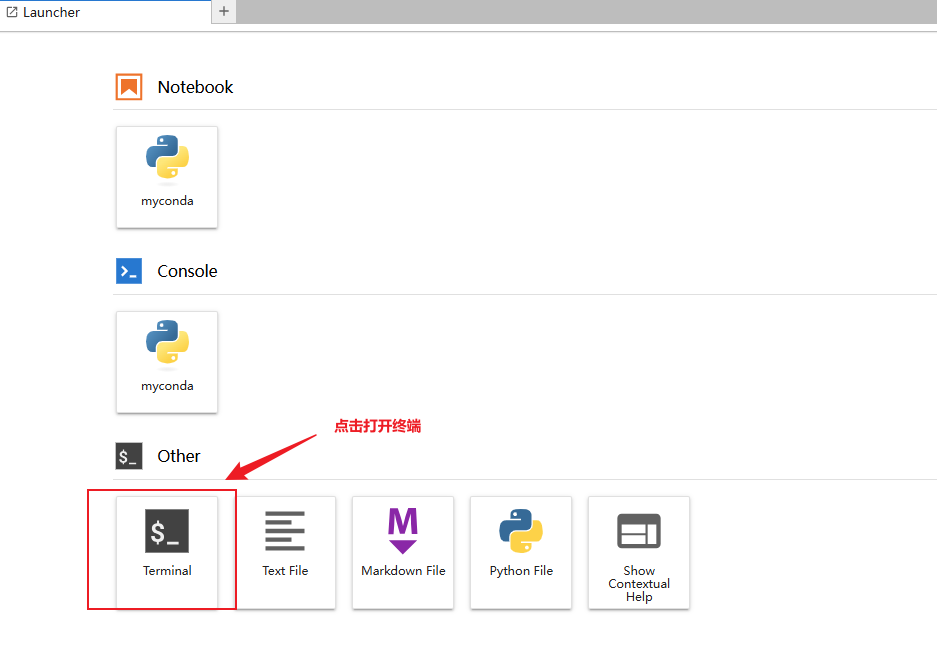 进入 JupyterLab 后,在主页面会看到如下选项。点击“Terminal”终端以进入命令行界面,开始下载流程。