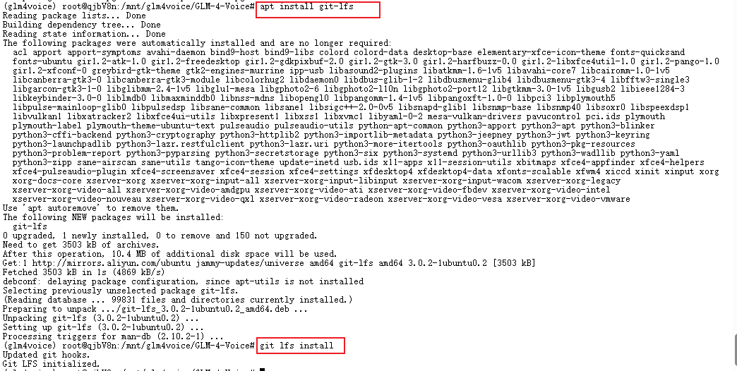 以下代码用于安装和配置 Git LFS(Large File Storage),这是一种扩展工具,帮助 Git 管理和跟踪大型文件,通过 apt 安装 Git LFS 工具,使 Git 能够有效管理大型文件(如图像、视频等),避免大文件对 Git 仓库性能的影响。随后命令初始化 Git LFS,并将其与当前用户的 Git 配置关联。执行此命令后,Git LFS 会自动跟踪并处理被指定为大文件的文件类型,提高 Git 操作的效率和速度。