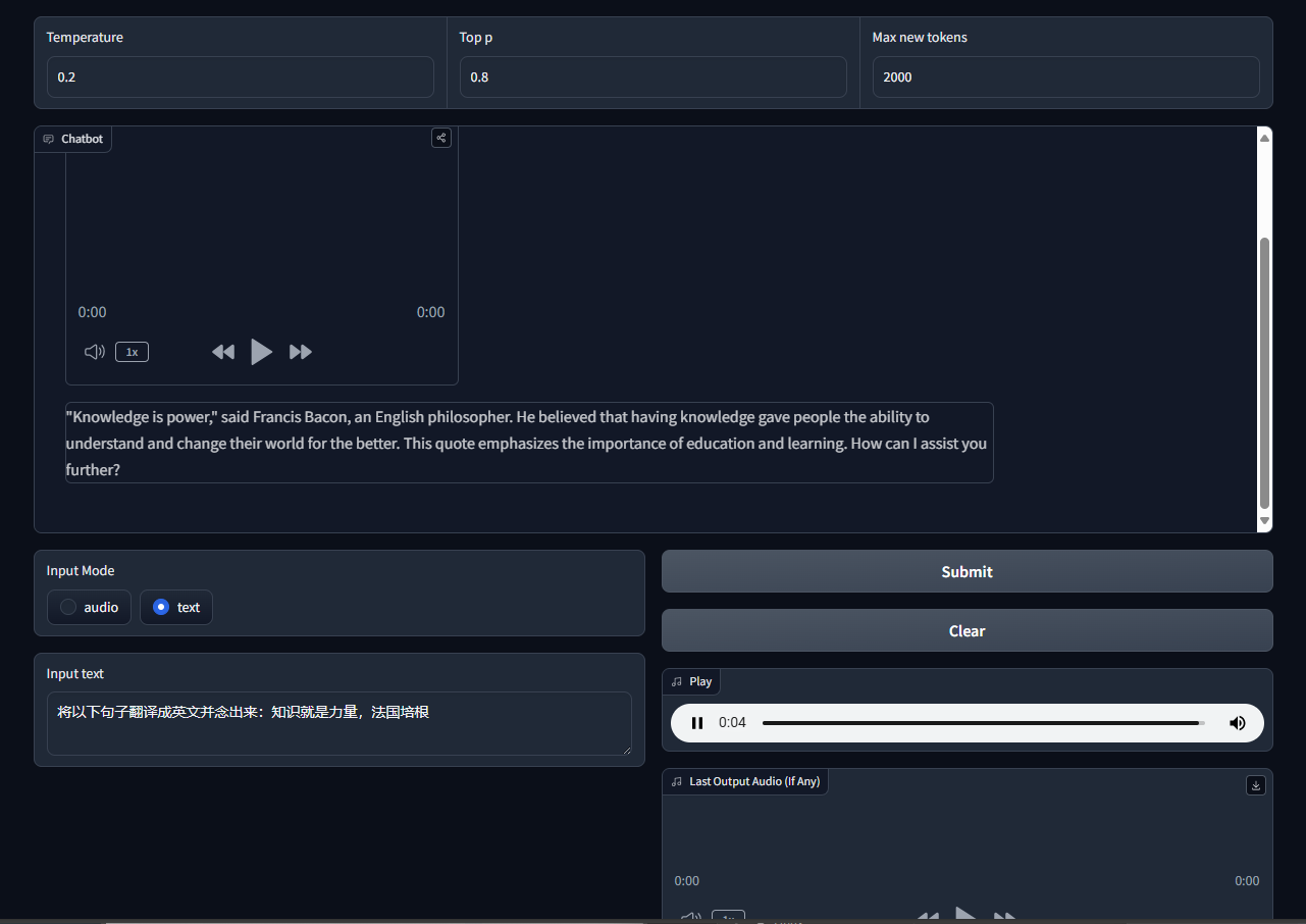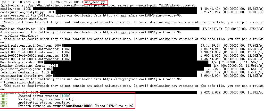 随后在终端输⼊以下指令,可以发现在平台上部署成功。可以看到,终端返回了前⾯trans.py⽂件提出的三个问题。