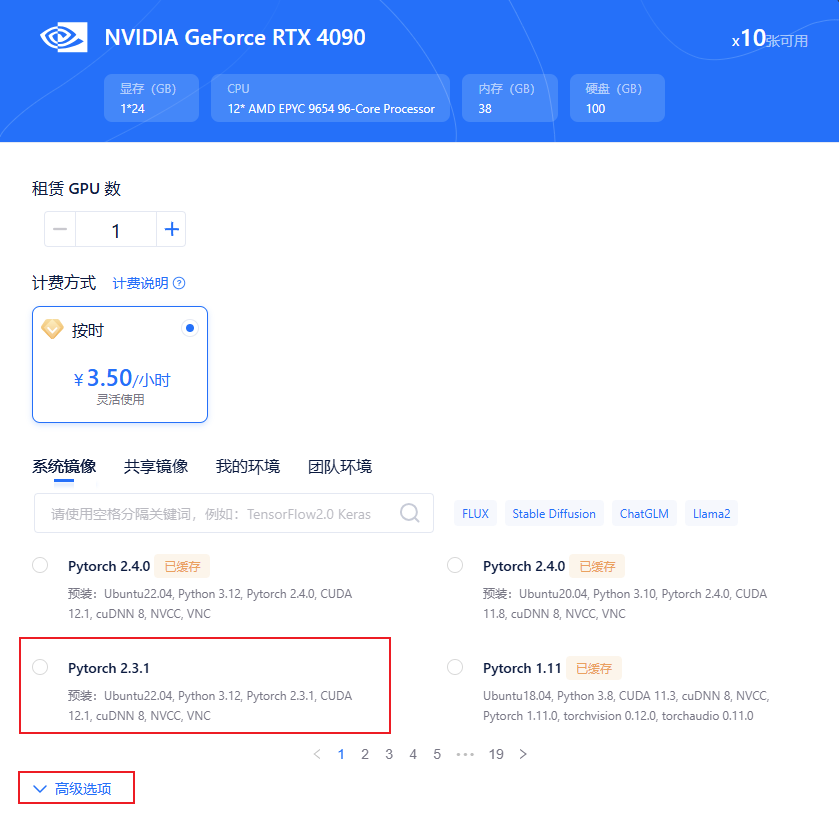 pytorch建议选择2.3.1版本,同时选择高级选项可以设置公钥或自定义端口。