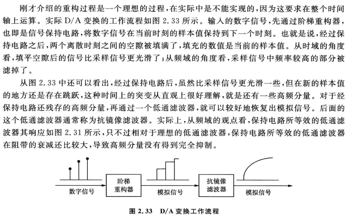 数字信号 到 模拟信号的转换:理论上是通过一个 理想低通滤波器,实际是 保持电路 和 抗镜像滤波器。