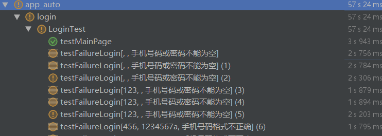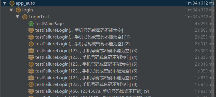这样,当用例执行的时候,根据设定的重跑次数(当前设定为2),每条用例执行以后,如果失败会再重跑2次,所以每条用例一共会执行3次。通过如下日志可以看到,当用例第一次手机号和密码都输入空的时候登录,用例执行失败,进入用例重跑,执行2次以后,当重跑次数为3的时候,自动进入失败用例截图然后重置重跑次数,进入下一条用例数据(手机号为123,密码为空)。