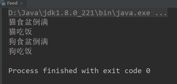 public class Feed { public static void main(String[] args) { Cat cat = new Cat(); Dog dog = new Dog(); Person person = new Person(); //饲养员喂猫 person.feed(cat); //饲养员喂狗 person.feed(dog); } }