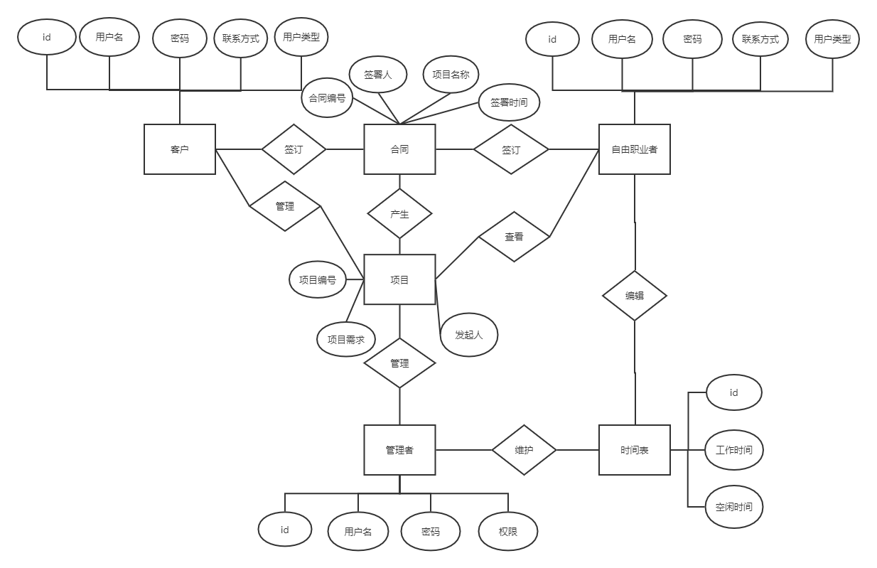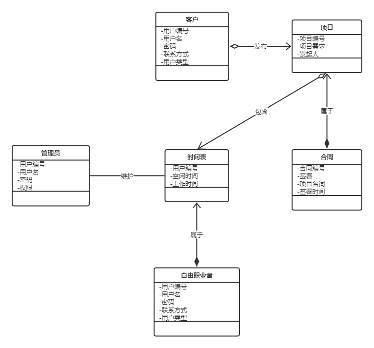 概念类:管理员,自由职业者,客户,项目,合同,时间表
