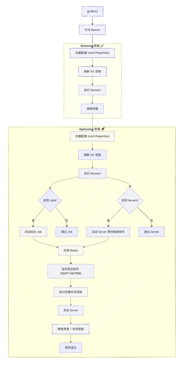 bootstrap阶段:用于加载远程配置、初始化基础环境等预处理工作,执行完毕后资源及时销毁。application阶段:核心应用逻辑阶段,涵盖配置加载、IoC 初始化、任务调度、服务启动与监听等。