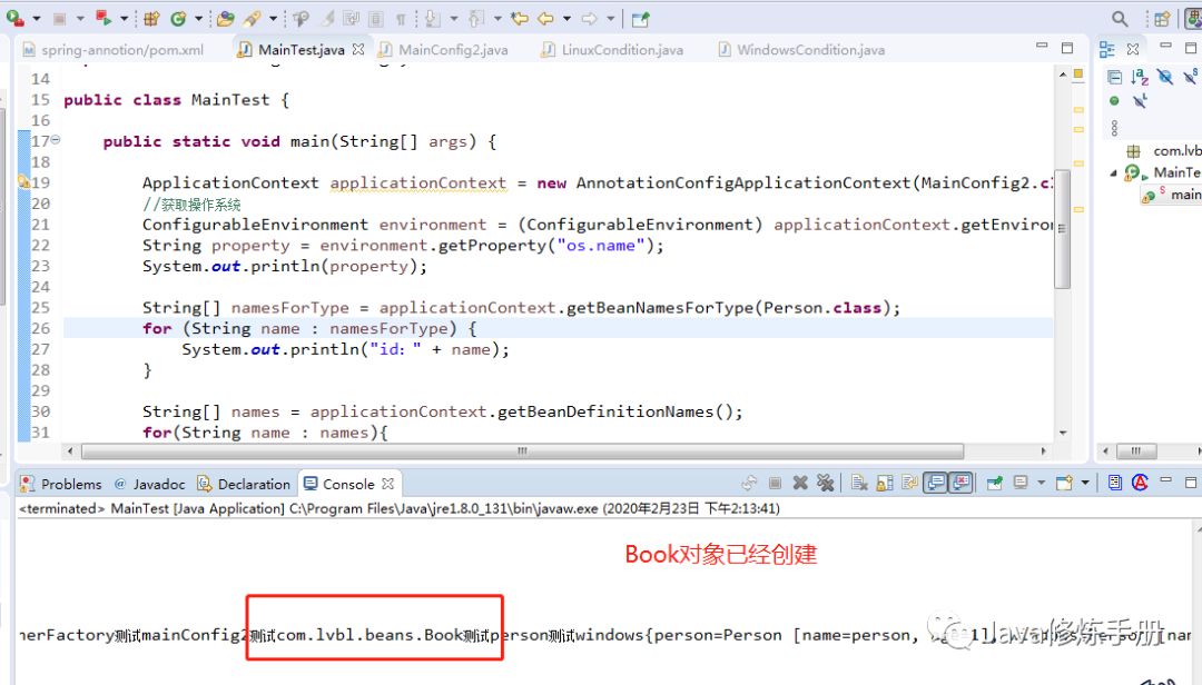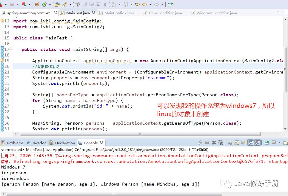 public class WindowsCondition implements Condition{/*** ConditionContext:判断条件能使用的上下文(环境)* AnnotatedTypeMetadata:注释信息*/public boolean matches(ConditionContext context, AnnotatedTypeMetadata metadata) {// TODO是否linux系统//获取当前环境信息Environment environment = context.getEnvironment();String property = environment.getProperty("os.name");if(property.contains("Windows")){return true;}return false;}}