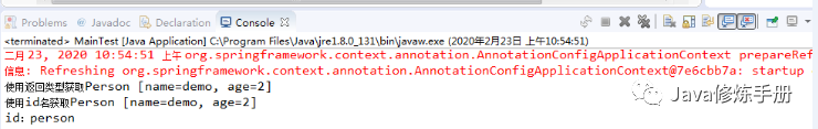 ApplicationContext applicationContext = new AnnotationConfigApplicationContext(MainConfig.class);//用返回类型获取beanPerson bean = applicationContext.getBean(Person.class);System.out.println("使用返回类型获取" + bean);//使用id获取Person bean1 = (Person) applicationContext.getBean("person");System.out.println("使用id名获取" + bean1);String[] namesForType = applicationContext.getBeanNamesForType(Person.class);for (String name : namesForType) {System.out.println("id:" + name);}