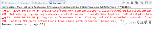 public class MainTest {public static void main(String[] args) {ApplicationContext applicationContext = new ClassPathXmlApplicationContext("beans.xml");Person bean = (Person) applicationContext.getBean("person");System.out.println(bean);}}