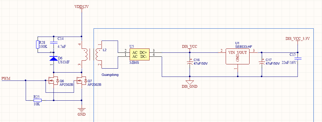 该电路可以使用5-30V的电源用于共模电感的一次侧供电,由单片机输出一个固定频率的PWM波形,频率在100KHz左右(具体要实际测量),使得共模电感一次侧出现交变的电流,交变的电流产生交变磁场,使得二次侧发生感应电动势,从而产生电压。