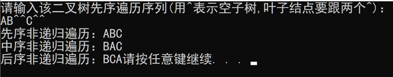 1 #define _CRT_SECURE_NO_WARNINGS 2 #include <stdio.h> 3 #include <stdlib.h> 4 #define MAXSIZE 100 5 6 typedef struct Node 7 {/*二叉树*/ 8 char data; 9 struct Node* Lchild; 10 struct Node* Rchild; 11 }BTNode; 12 13 typedef struct 14 {/*定长顺序栈*/ 15 BTNode* elem[MAXSIZE]; 16 int top; 17 }SeqStack; 18 19 SeqStack* InitStack(); 20 int IsEmptyStack(SeqStack* A); 21 int PushStack(SeqStack* A, BTNode* B); 22 int PopStack(SeqStack* A, BTNode** B); 23 int TopStack(SeqStack* A, BTNode** B); 24 25 BTNode* CreateBinaryTree(); 26 void PreOrder(BTNode* A); 27 void InOrder(BTNode* A); 28 void PostOrder(BTNode* A); 29 30 int main(void) 31 { 32 BTNode* A; 33 34 printf("请输入该二叉树先序遍历序列(用^表示空子树,叶子结点要跟两个^):\n"); 35 A = CreateBinaryTree(); 36 37 printf("先序非递归遍历:"); 38 PreOrder(A); 39 40 printf("\n中序非递归遍历:"); 41 InOrder(A); 42 43 printf("\n后序非递归遍历:"); 44 PostOrder(A); 45 46 system("pause"); 47 return 0; 48 } 49 50 SeqStack* InitStack() 51 { 52 SeqStack* A; 53 A = (SeqStack*)calloc(1, sizeof(SeqStack)); 54 A->top = -1; 55 return A; 56 } 57 58 int IsEmptyStack(SeqStack* A) 59 { 60 if (A->top == -1) 61 {/*空栈*/ 62 return 1; 63 } 64 else 65 { 66 return 0; 67 } 68 } 69 70 int PushStack(SeqStack* A, BTNode* B) 71 { 72 if (A->top == MAXSIZE - 1) 73 { 74 return 1; 75 } 76 else 77 { 78 A->top++; 79 A->elem[A->top] = B; 80 /*printf("\n结点%c进栈了\n", A->elem[A->top]->data);*/ 81 return 0; 82 } 83 } 84 85 86 int PopStack(SeqStack* A , BTNode** B) 87 { 88 if (IsEmptyStack(A)) 89 { 90 return 1; 91 } 92 else 93 { 94 (* B) = A->elem[A->top]; 95 /*printf("\n结点%c出栈了\n", (*B)->data);*/ 96 A->top--; 97 return 0; 98 } 99 } 100 101 int TopStack(SeqStack* A, BTNode** B) 102 { 103 if (IsEmptyStack(A)) 104 { 105 return 1; 106 } 107 else 108 { 109 (*B) = A->elem[A->top]; 110 return 0; 111 } 112 } 113 114 BTNode* CreateBinaryTree() 115 { 116 BTNode* A = NULL; 117 char ch = '\0'; 118 119 ch = getchar(); 120 if (ch == '^') 121 { 122 return NULL; 123 } 124 else 125 { 126 A = (BTNode*)calloc(1, sizeof(BTNode)); 127 A->data = ch; 128 A->Lchild = CreateBinaryTree(A->Lchild); 129 A->Rchild = CreateBinaryTree(A->Rchild); 130 return A; 131 } 132 } 133 134 void PreOrder(BTNode* A) 135 {/*先序非递归遍历*/ 136 SeqStack* B = InitStack(); 137 while (A != NULL || !IsEmptyStack(B)) 138 {/*当前结点指针及栈均空,则结束*/ 139 if(A != NULL) 140 {/*访问根节点,根指针进栈,进入左子树*/ 141 printf("%c", A->data); 142 PushStack(B, A); 143 A = A->Lchild; 144 } 145 else 146 {/*根指针退栈,进入其右子树*/ 147 PopStack(B, &A); 148 A = A->Rchild; 149 } 150 } 151 } 152 153 void InOrder(BTNode* A) 154 {/*中序非递归遍历*/ 155 SeqStack* B = InitStack(); 156 while (A != NULL || !IsEmptyStack(B)) 157 { 158 if (A != NULL) 159 { 160 PushStack(B, A); 161 A = A->Lchild; 162 } 163 else 164 { 165 PopStack(B, &A); 166 printf("%c", A->data); 167 A = A->Rchild; 168 } 169 } 170 } 171 172 void PostOrder(BTNode* A) 173 { 174 SeqStack* B = InitStack(); 175 BTNode* P = NULL; 176 while (A != NULL || !IsEmptyStack(B)) 177 { 178 if (A != NULL) 179 { 180 PushStack(B, A); 181 A = A->Lchild; 182 } 183 else 184 { 185 TopStack(B, &A); 186 if (A->Rchild == NULL || A->Rchild == P) 187 {/*判断栈顶结点的右子树是否为空,右子树是否刚访问过*/ 188 PopStack(B, &A); 189 printf("%c", A->data); 190 P = A; 191 A = NULL; 192 } 193 else 194 { 195 A = A->Rchild; 196 } 197 } 198 } 199 }