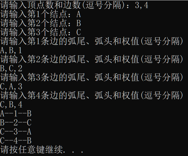 75 printf("请输入第%d条边的弧尾、弧头和权值(逗号分隔)\n", k);