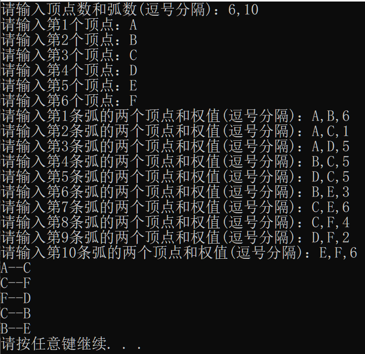 1 /*********************************************************** 2 * Name: Prim 3 * Called By: main 4 * Parameter: G 无向网, start 起始顶点下标 5 * Description: 通过辅助数组closedge来依次查找最小权值邻接顶点; 6 * 并打印查找到的最小权值的顶点和它的邻接顶点 7 ************************************************************/ 8 void Prim(AdjMatrix* G, int start) 9 { 10 struct 11 { 12 int adjvex; 13 int lowcost; 14 }closedge[MAXVEX] = { 0 };/*辅助数组*/ 15 16 int i = 1; 17 int j = 1; 18 int k = 1; 19 int minvex = 0;/*最小权值的邻接顶点*/ 20 int minweight = 0;/*最小权值*/ 21 22 closedge[start].lowcost = 0; 23 /*对除了出发点start以外的所有顶点初始化对应的closedge数组*/ 24 for (i = 1; i <= G->vexnum; i++) 25 { 26 if (i != start) 27 { 28 closedge[i].adjvex = start; 29 closedge[i].lowcost = G->arcs[start][i]; 30 } 31 } 32 33 /*控制选中的n - 1条符合条件的边*/ 34 for (i = 1; i <= G->vexnum - 1; i++) 35 { 36 /*选择最小权值的邻接顶点*/ 37 minweight = INFINITY; 38 for (j = 1; j <= G->vexnum; j++) 39 { 40 if (closedge[j].lowcost != 0 && closedge[j].lowcost < minweight) 41 { 42 minvex = j; 43 minweight = closedge[j].lowcost; 44 } 45 } 46 printf("%c--%c\n", G->vex[closedge[minvex].adjvex], G->vex[minvex]); 47 closedge[minvex].lowcost = 0;/*标记该顶点不会再次被遍历*/ 48 49 /*更新closedge数组*/ 50 for (k = 1; k <= G->vexnum; k++) 51 { 52 /*一旦发现有更小的权值出现,则更新closedge数组对应顶点的最小权值*/ 53 if (k != minvex && G->arcs[minvex][k] < closedge[k].lowcost) 54 { 55 closedge[k].adjvex = minvex; 56 closedge[k].lowcost = G->arcs[minvex][k]; 57 } 58 } 59 } 60 }