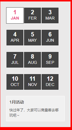 <!DOCTYPE html> <html> <head> <meta charset="utf-8" /> <title>JavaScript的简易日历</title> <meta name="viewport" content="width=device-width, initial-scale=1"> <link rel="stylesheet" type="text/css" href="style.css"/> </head> <body> <div id="tab" class="calendar"> <ul> <li class="active"><h2>1</h2><p>JAN</p></li> <li><h2>2</h2><p>FER</p></li> <li><h2>3</h2><p>MAR</p></li> <li><h2>4</h2><p>APR</p></li> <li><h2>5</h2><p>MAY</p></li> <li><h2>6</h2><p>JUN</p></li> <li><h2>7</h2><p>JUL</p></li> <li><h2>8</h2><p>AUG</p></li> <li><h2>9</h2><p>SEP</p></li> <li><h2>10</h2><p>OCT</p></li> <li><h2>11</h2><p>NOV</p></li> <li><h2>12</h2><p>DEC</p></li> </ul> <div class="text"> <h2>1月活动</h2> <p>快过年了,大家可以商量着去哪玩吧~</p> </div> </div> </body> </html>