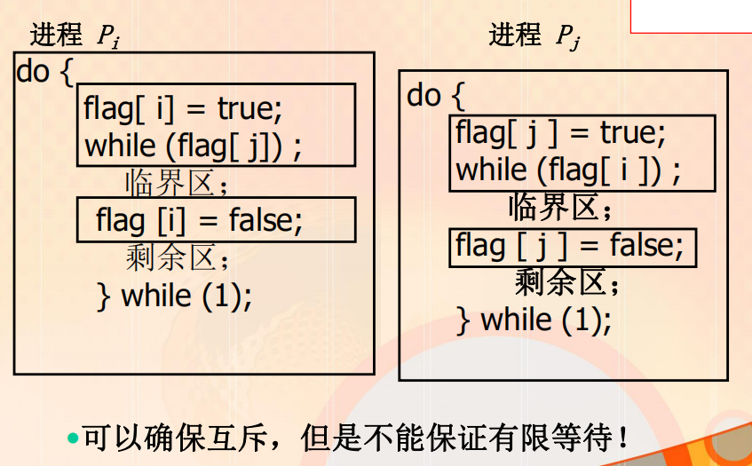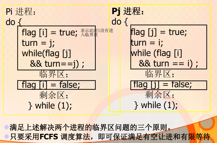 刚开始i,j均为false。先跑Pi,一直跑,因为在跑的过程中flag[j]的值一直为false。