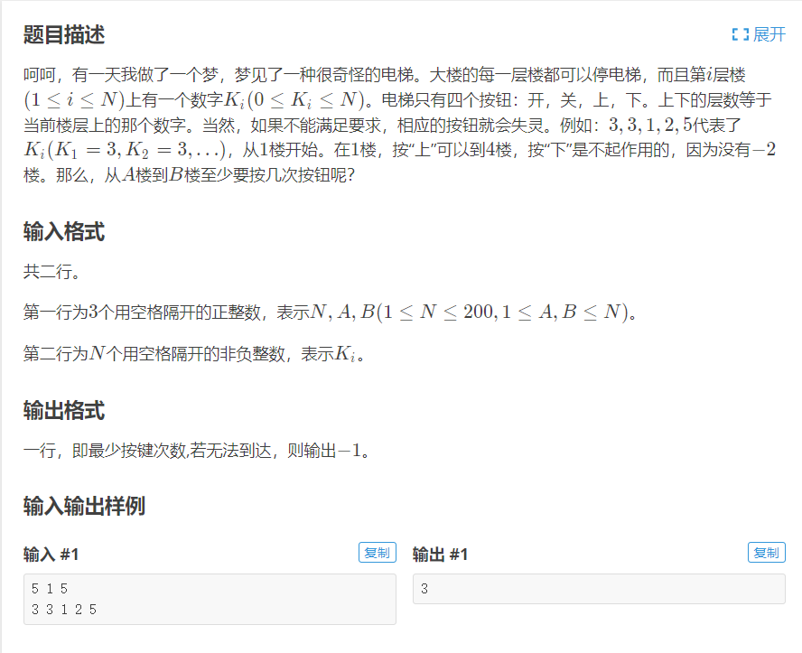 #include<bits/stdc++.h> using namespace std; int n,a,b; int dis[201],f[201]; queue<int> q; bool check(int x){ return x>=1&&x<=n; } void bfs() { int t; while(!q.empty()){ int p=q.front(); q.pop(); if(p==b){ cout<<dis[b]; return; } t=p+f[p]; if(check(t)&&dis[t]==0){//注意进行判断是否已经经历过这个楼层 dis[t]=dis[p]+1; q.push(t); } t=p-f[p]; if(check(t)&&dis[t]==0){ dis[t]=dis[p]+1; q.push(t); } } cout<<-1; } int main() { cin>>n>>a>>b; for (int i = 1; i <= n; i++){ cin>>f[i]; } q.push(a); dis[a]=0; bfs(); return 0; }