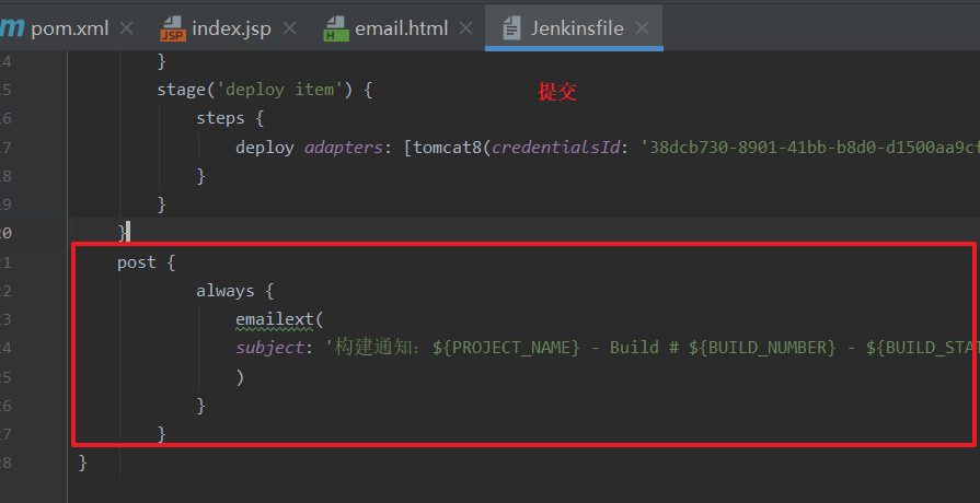 然后 编写Jenkinsfile添加构建后发送邮件(添加红色代码段 post部分)