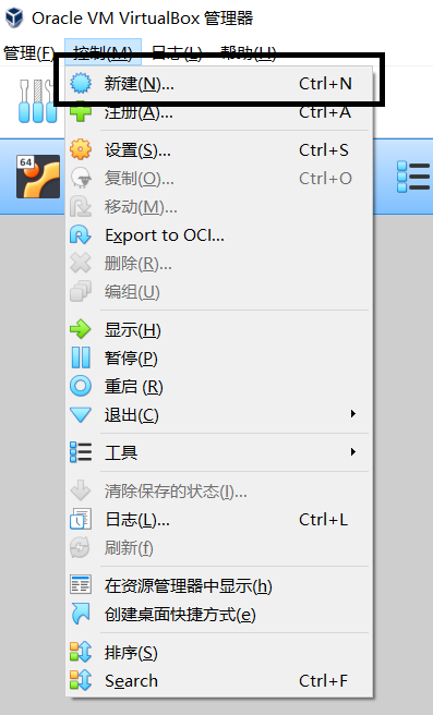 打开Vbox管理器-选择toolbar上面的控制按钮-点击新建