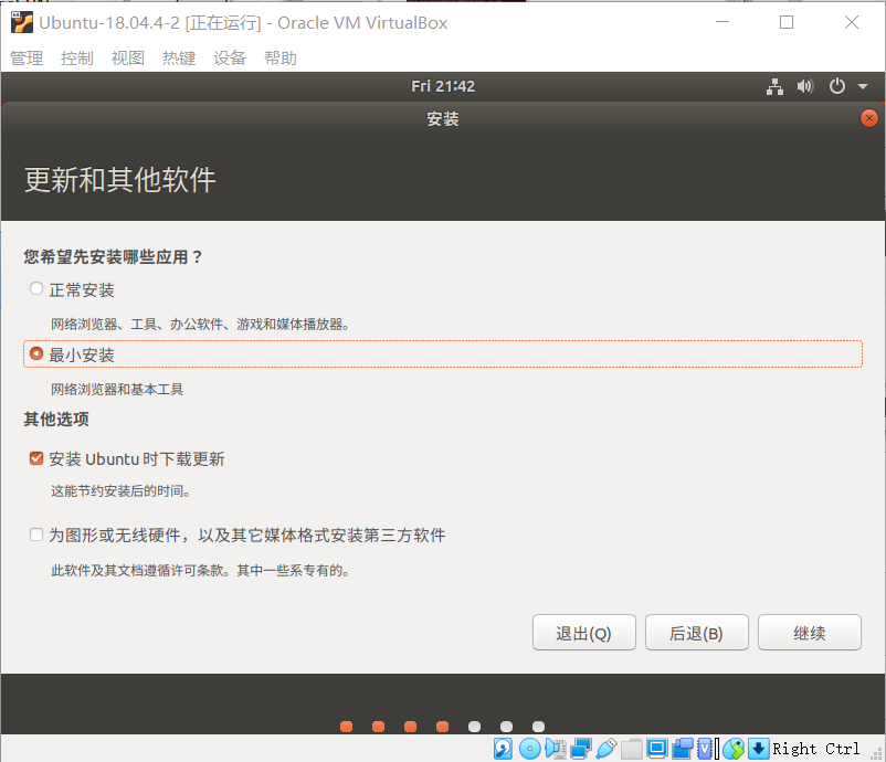 - 选中最小安装,当然也可以选中正常安装。点击继续