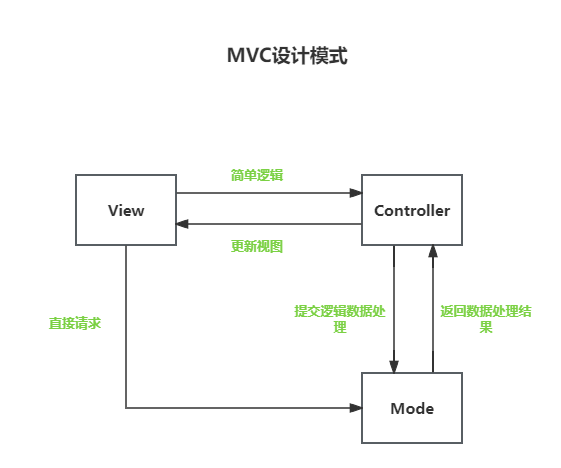 MVC由Mode、View、Controller三者组成,Mode负责逻辑数据处理,View负责视图的交互,Controller控制器负责View与Mode交互。