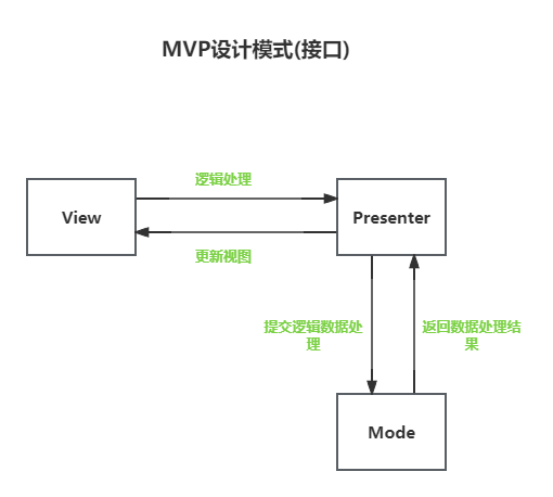 Presenter:以接口的方式进行交互处理。View逻辑交互,处理获取Mode原始数据后进行逻辑处理。处理完成后并对View和Mode进行相应操作。