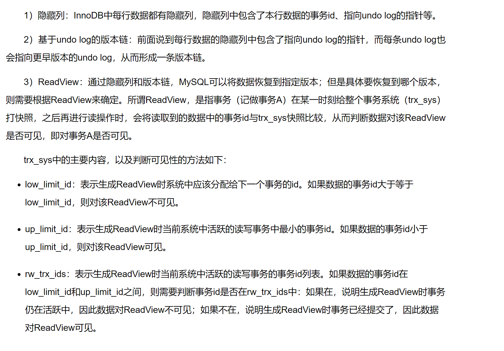 MVCC避免重复度和幻读的手段,在A事物开始执行前形成快照,readview,如果对另一个事物不可见,读取上一个版本的undolog B要么没开始id 小于 要么开始了但是还没提交在limit之内rw