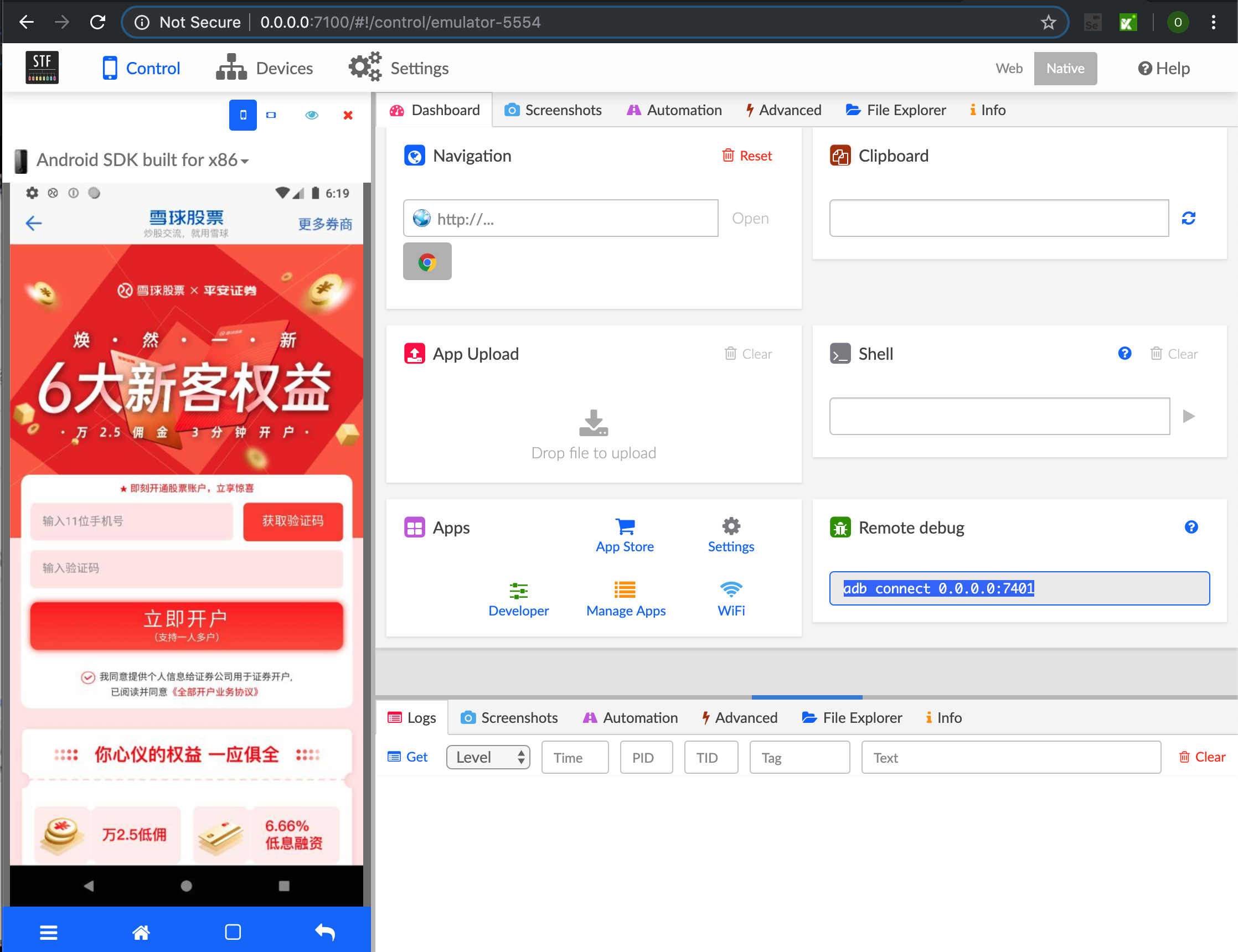 在命令行输入 adb connect 0.0.0.0:7401,在stf控制台点击add key。adb connect可以获取更多的权限。
